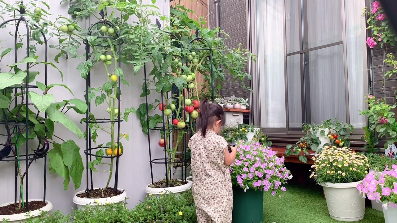 Cô con gái nhỏ luôn hào hứng mỗi khi được ra vườn phụ mẹ chăm cây, thu hoạch rau trái.