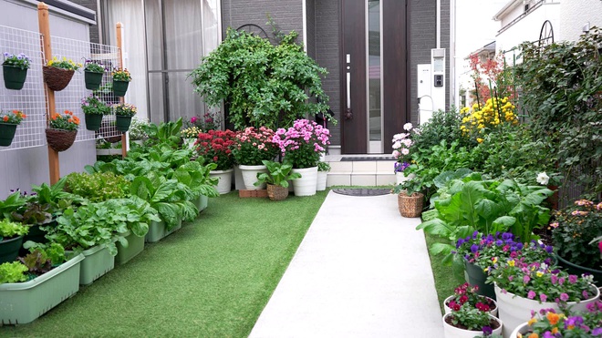 Tận dụng khoảng trống ở sân trước, chị Được khiến ngôi nhà của gia đình trở nên nổi bật giữa những công trình hiện đại xung quanh bằng vườn rau xanh đủ các loại và hoa rực rỡ màu sắc.