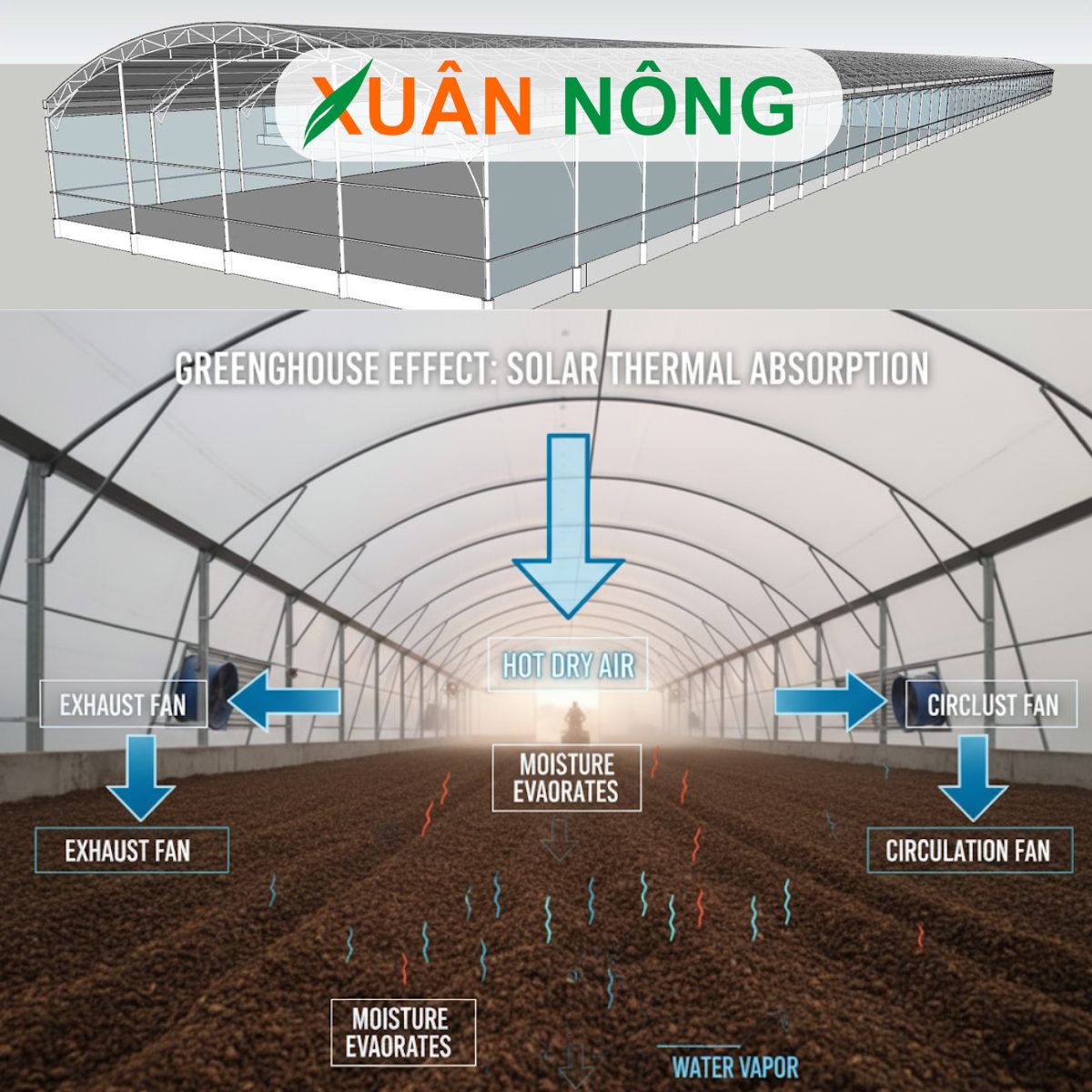 Ánh nắng mặt trời xuyên qua màng PE hoặc tấm polycarbonate, làm nhiệt độ bên trong tăng từ 45 đến 65 độ C. Không khí nóng bên trong lưu chuyển nhờ hệ thống quạt đối lưu và quạt hút ẩm, giúp hơi nước thoát ra nhanh, phân khô đều, giảm mùi và diệt khuẩn tự nhiên.