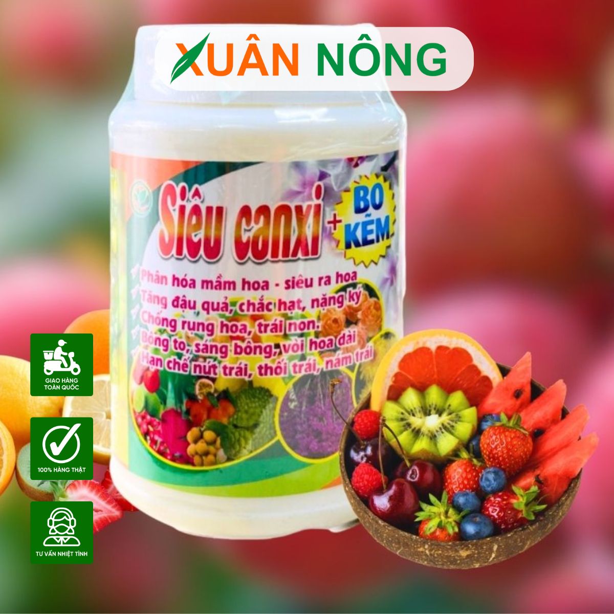 Thành phần chính: Sản phẩm thường chứa hàm lượng cao canxi (Ca), kết hợp với bo (B) và kẽm (Zn) – là 3 vi lượng quan trọng đối với cây trồng, đặc biệt trong giai đoạn ra hoa, đậu quả và nuôi trái.