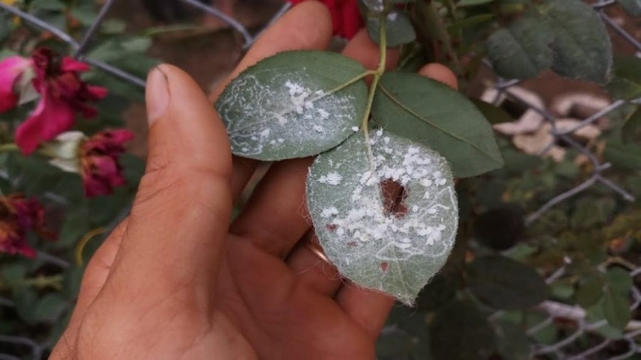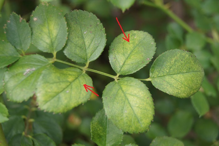 Cây hoa hồng bị hại nhẹ thì trên phiến lá có đốm trắng nhỏ, phần này bị vàng đi, ảnh hưởng đến sự sinh trưởng của cây hồng;