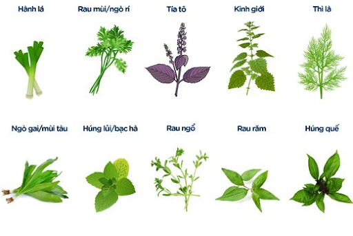 9. Rau thơm (húng quế, tía tô, rau răm, diếp cá,…)