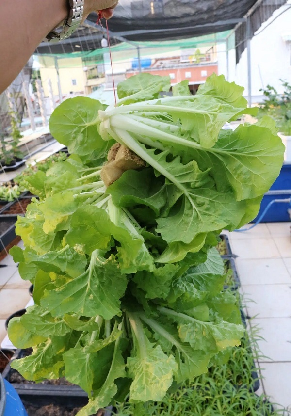 Hiện tại trên vườn đang có nhiều loại xà lách, cải xanh, rau muống và dưa leo, bầu, mướp... Anh Đặng đang trồng thêm cải làm dưa, với hy vọng Tết này sẽ có món dưa chua đãi khách.