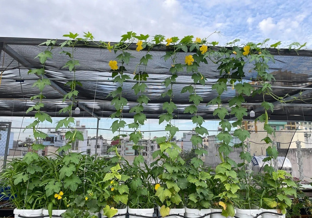 Trên sân thượng của anh, ngoài mô hình aquaponics (gồm một bể cá và các chậu rau, đường ống), anh Đặng còn lắp thêm hệ thống rau thủy canh, thủy canh cây ăn trái. Tổng chi phí hơn 80 triệu đồng.