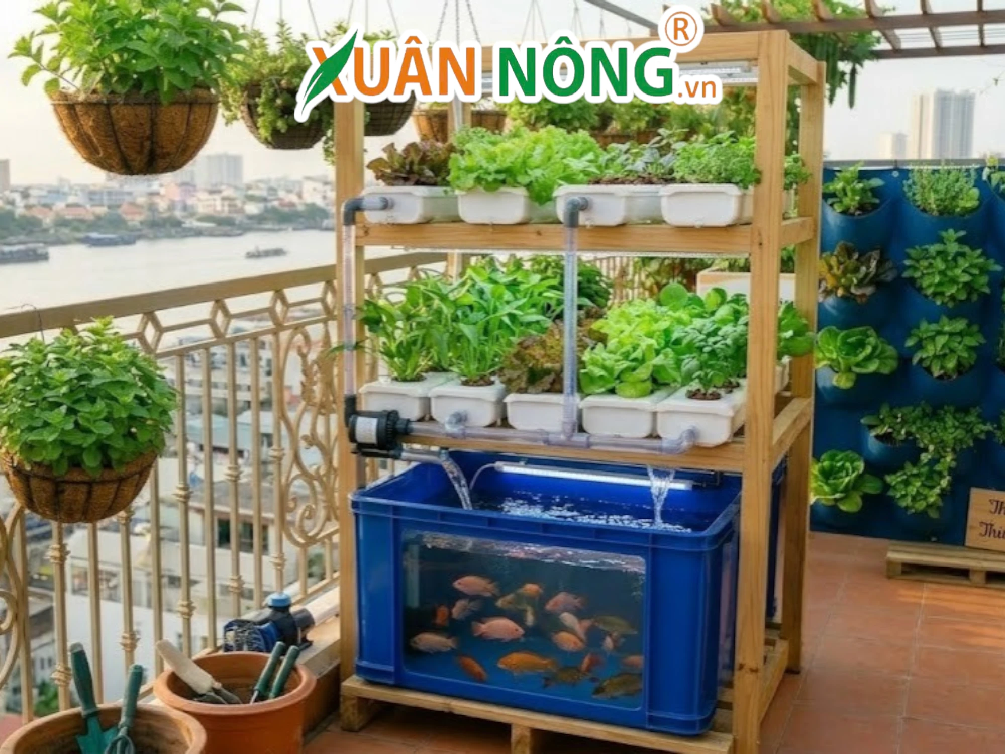Aquaponics là hệ sinh thái khép kín tích hợp nuôi cá và trồng rau trong một vòng tuần hoàn sinh học: chất thải của cá được vi khuẩn nitrat hóa (Nitrosomonas, Nitrobacter) chuyển hóa thành nguồn đạm hữu cơ nuôi cây; nước sau khi qua hệ thống rễ cây được lọc sạch trả về bể cá. Ba thành phần cá — thực vật — vi khuẩn cùng duy trì cân bằng hệ thống mà không cần phân bón hay thay nước thường xuyên.