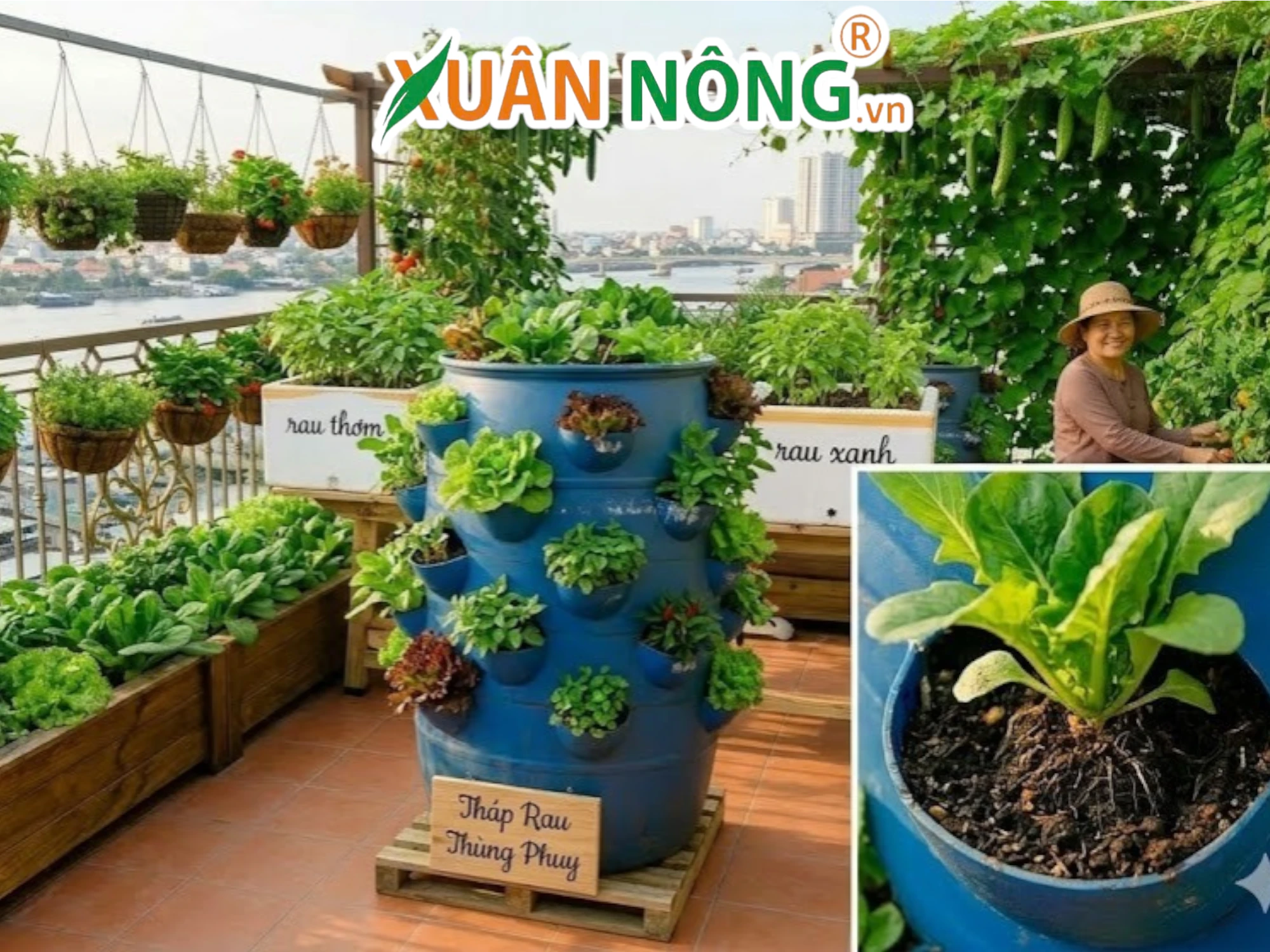 Mô hình tháp tận dụng chiều cao thay vì chiều rộng — lý tưởng cho ban công chung cư chỉ 2 – 4 m². Sử dụng thùng phuy hoặc ống nhựa lớn, khoét các hốc trồng cây theo chu vi thân thùng theo từng tầng cao. Điểm đặc biệt là đặt ống nhựa đục lỗ ở trung tâm để nạp phân compost từ rác hữu cơ gia đình (vỏ rau củ, bã cà phê, vỏ trứng) — vừa xử lý rác hữu cơ tại chỗ vừa tạo nguồn phân bón tự nhiên liên tục cho cây xung quanh. Phù hợp nhất với rau ăn lá, rau gia vị có bộ rễ cạn.