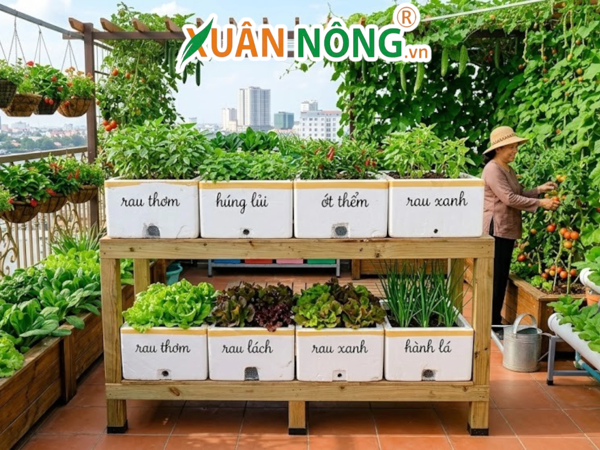 Đây là mô hình phổ biến nhất nhờ chi phí thấp, dễ thực hiện và linh hoạt trong bố trí không gian. Về lựa chọn vật chứa, thùng xốp lớn (thể tích 50 – 80 lít) phù hợp với cây ăn quả ngắn ngày như bầu, bí, mướp, cà chua; thùng nhỏ (20 – 30 lít) đủ cho các loại rau ăn lá như cải ngọt, mồng tơi, rau dền.